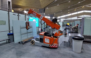 В петербургском аэропорту Пулково смонтировали стеклянные перегородки с помощью мини-крана MPK20 и вакуумного захвата Арлифт.