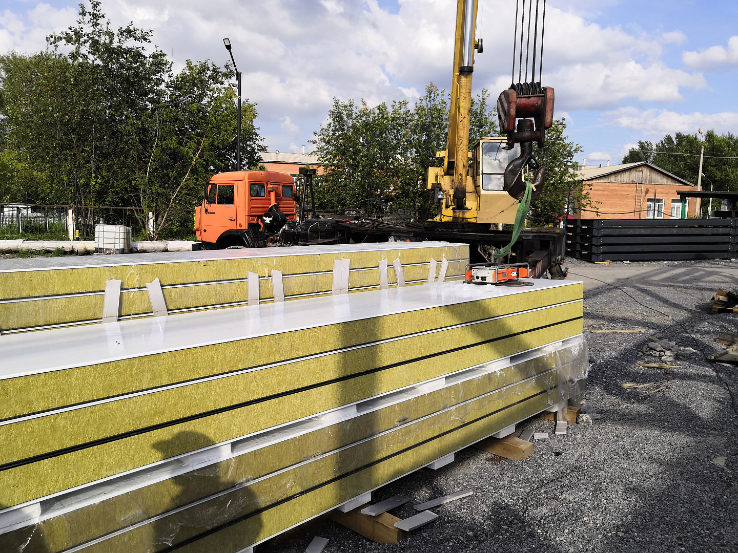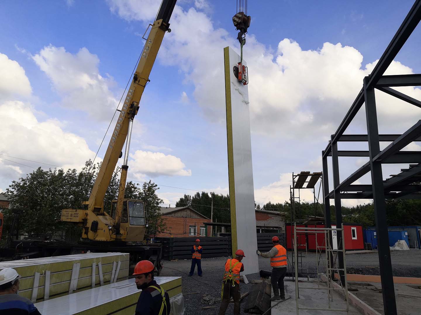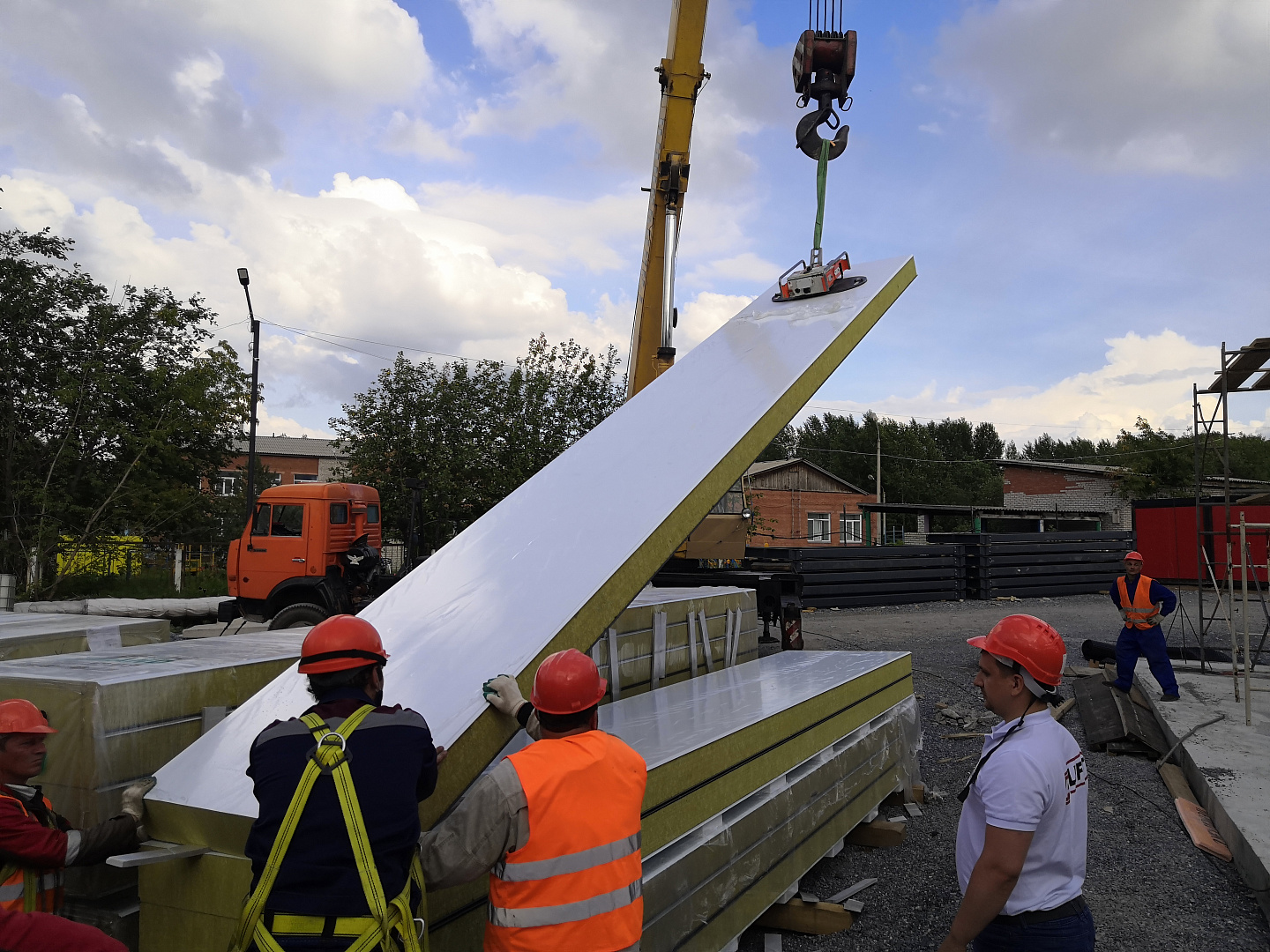 Панели длиной 6 метров и толщиной 180 мм монтировал вакуумный захват компании Арлифт, Arlifter GS-500, предназначенный для монтажа стекла и сэндвич-панелей весом до 500 кг.