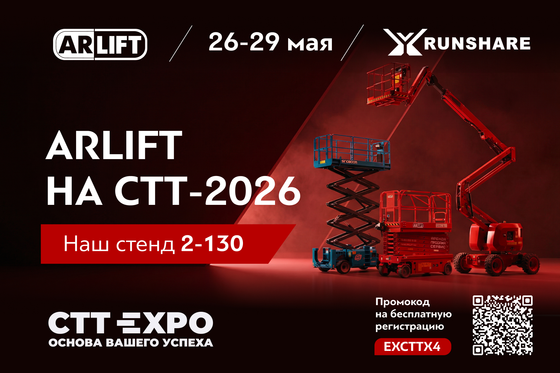На нашем стенде 2-130 вы увидите парк ARLIFT вживую: подъёмники (AWP) от нашего партнёра-производителя RUNSHARE, мини-краны и вакуумные захваты собственного производства для стекла и сэндвич-панелей. Последние — наша собственная разработка, адаптированная под российские условия. Именно они помогали остеклить Лахта-Центр и Москва-Сити.